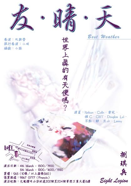 與劇無緣, 本來三月初的演出, 卻因為外婆的葬禮, 不得不辭演, 嗯... 我也不知道是好還是壞, 好的是, 我的爛演技, 不會把他們拖垮, 壞的是, 又不能演出了... 新的 UNCLE RAY (我的角色), 剛開始排練, 很多地方還是不太熟, 嗯... 昨天看到他的排練, 感覺他比我更適合這個角色... 很成熟, 可是又有幾分天真... 新 UNCLE RAY, 加油哦!! ^^